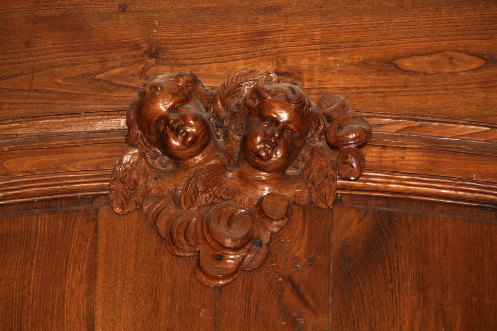 Chaque panneau est ponctué d'éléments sculptés : bouquets de fleurs, têtes d'anges