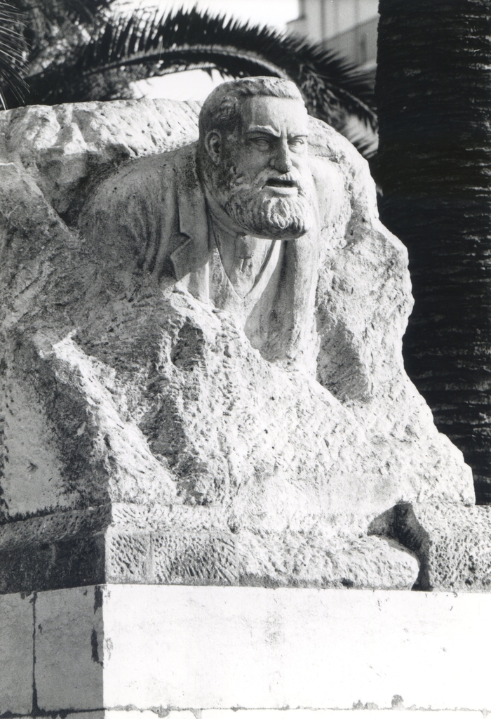 buste du tribun Jaurès jaillissant vers l'avant hors du bloc de pierre