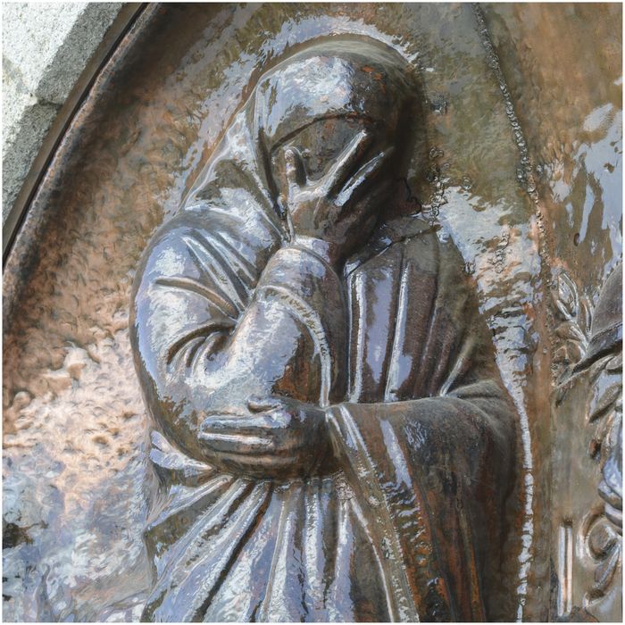 deux femmes debout entourant une stèle où sont déposés un casque militaire et des branches de laurier ; soldat agenouillé tenant fusil, et soldat assis montant la garde dans une tranchée, sur la porte de gauche ; femme nue assise tenant une fleur, et femme drapée assise tenant un rameau de laurier, sur porte de droite