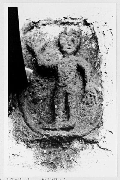 Pierre remployée dans le mur est, sculptée en relief peu saillant d'une figure humaine.