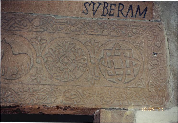 Transcription de l'inscription sur le bandeau : (...) J HOC QVI COENOBIV (M) CVPITIS TRANSIRE DECORV (M) POSCITE SE (M) P (E) R ABBATI (S) VENIA (M) LIVTHAR (DI) / SVPERAM (...?), d'après Jean-Philippe Meyer. Inscription sur le médaillon de l'Agneau mystique : AGNUS (DEI) DE SUPERIS HIC (QUI) ORAVIT PRO CUNCTIS, d'après Jean Rott. Traduction de l'inscription : Vous qui désirez pénétrer dans ce beau couvent, demandez en toujours la (haute) permission à l'abbé Liuthard.