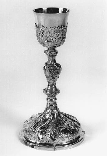 Sur le pied, cartouches rocaille avec épis de blé, raisins, coquilles et guirlandes de fleurs sur un piédestal. Sur la tige, fleurs sur les collerettes et les cartouches du noeud. Sur la fausse coupe, feuilles de vigne et raisins, épis de blé et fleurs.