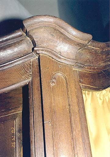 Confessionnal de plan chantourné, droit en élévation ; panneaux moulurés sur les angles, bordés de tores aux extrémités en volutes affrontées ; corniche moulurée, à ressauts. Agenouilloirs mobiles ; tablettes intérieures découpées. Fiches en fer forgé.
