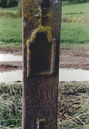 Croix en grès, aux bras trilobés, avec une niche sur la face antérieure, surmontée d'une croix. Christ en croix en fonte sur la face arrière (la croix a été retournée et le Christ est actuellement du côté du chemin).