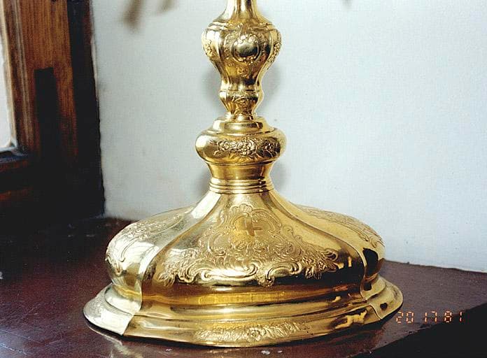 Pied en cuivre entièrement repoussé et ciselé ; tige fondue ; nuées au décor repoussé, en partie rapporté (angelots et couronne centrale).