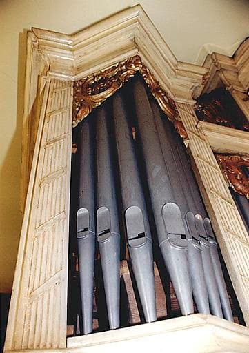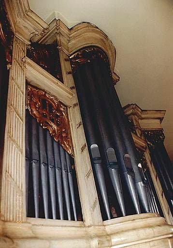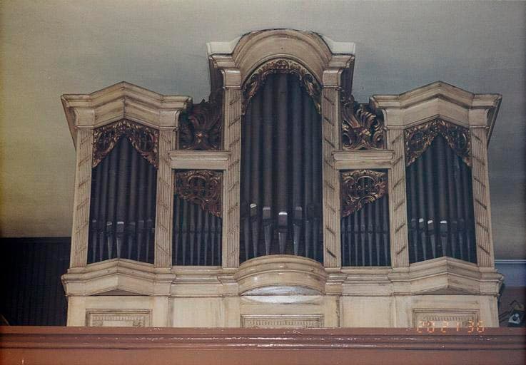 sapin, chêne : décor en bas-relief, ajouré, peint, fausse dorure ; étain
