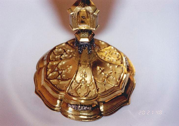 Pied à ressauts, orné d'angelots rapportés, de motifs en relief repoussé ; noeud formé de 3 niches abritant des statuettes rapportées ; coupe avec fausse coupe formée de feuilles pointues.