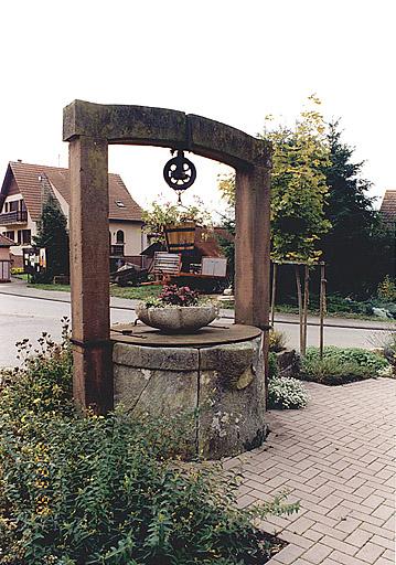 Puits à margelle circulaire, à 4 pans, munie de 2 consoles à seaux. Piédroits carrés, linteau en arc segmentaire. Poulie en fer forgé. Auge rectangulaire.