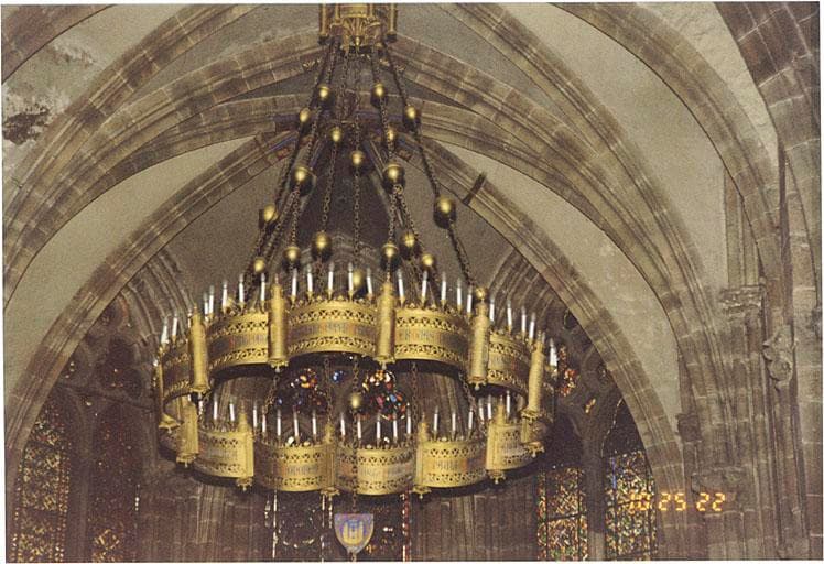 Douze plaques rectangulaires fondues en bronze, dorées et ciselées, bombées en arc de cercle sur leur longueur, comportent entre des frises ajourées de motifs végétaux une bande couverte d'une inscription émaillée ou peinte en rouge et en bleu. Solidarisées avec douze éléments cylindriques en forme de tours, ces plaques constituent une couronne à douze lobes surmontés chacun de cinq bougies. Cette couronne est attachée par des chaînes ornées de globes à une pièce cylindrique flanquée de six tourelles, à laquelle est également suspendu, par une chaîne, un écu émaillé portant des armoiries.