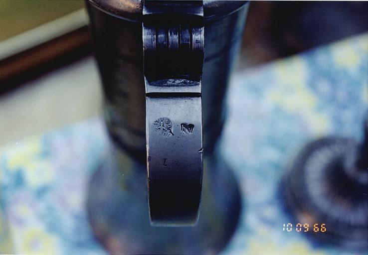 Poinçons sur l'anse : poinçon de maître de Antoine Joseph Bergmann au mineur et à la date 1801, poinçon de contrôle de Strasbourg pour l'étain commun (Riff, numéros 19 et 14).