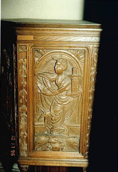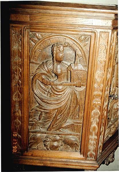 Ce meuble n'a pu être ouvert. De plan hexagonal irrégulier, il présente une partie supérieure fermée, ornée de panneaux sculptés en bas relief représentant des allégories de vertus (les têtes sont en partie traitées en haut relief), placées sous un arc, debout sur une terrasse sous laquelle figure un angelot. Le panneau réemployé sur la porte représente la Justice avec l'épée et le globe, celui à droite représente le Courage ou la Force : le personnage féminin extirpe un dragon d'une tour, celui à gauche enfin figure sans doute (de façon inhabituelle) la Foi : personnage féminin tenant une maquette d'église. De part et d'autre de chaque allégorie figurent des ornements végétaux et volutes en frise verticale. Sous la partie fermée sont rapportés un angelot et deux culots feuillagés. La partie inférieure du meuble consiste en une sorte d'exposition avec fond sculpté de tentures et frises verticales géométriques et végétales.