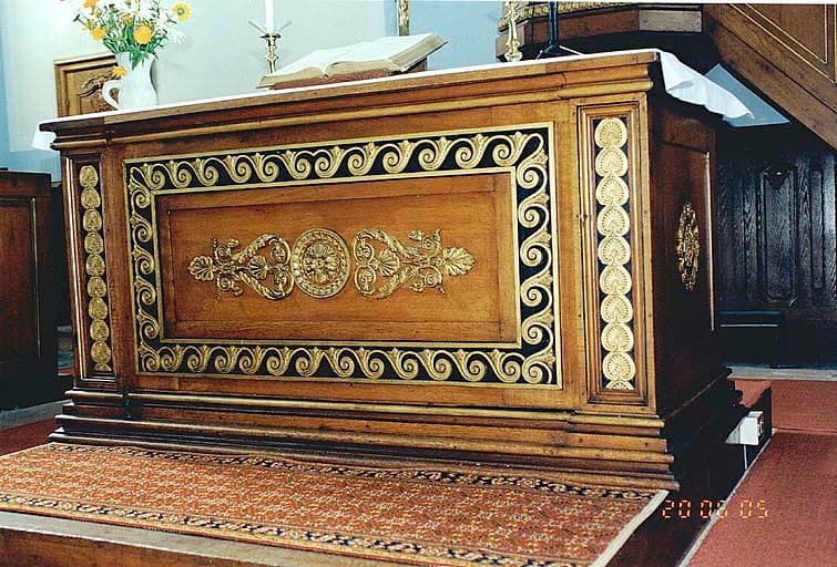 Autel de plan rectangulaire, aux élévations droites, en chêne, orné d'un décor en carton pâte rapporté.