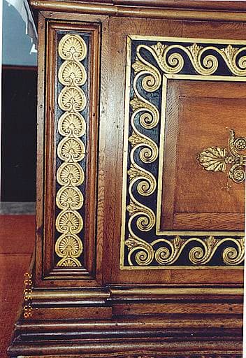 chêne ; carton-pâte : décor en bas-relief, décor rapporté, fausse dorure