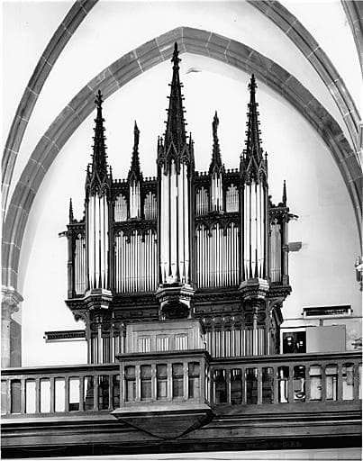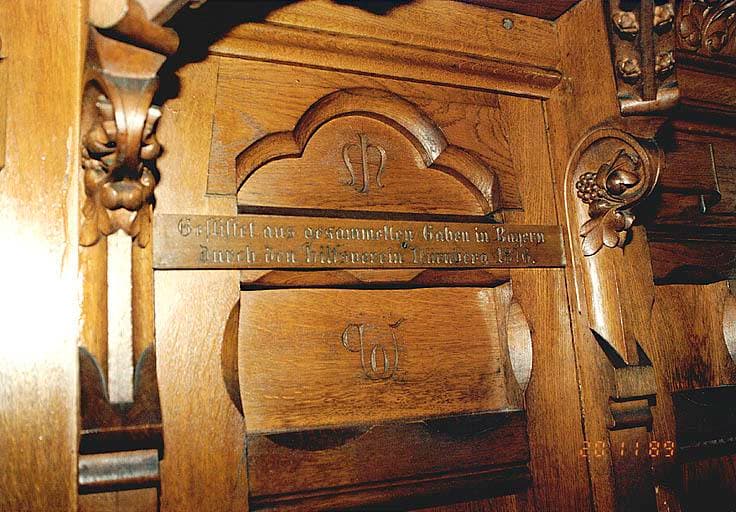 Buffet comprenant 3 tourelles, 2 demi-tourelles et 8 plates-faces : il est recoupé horizontalement par une corniche pour former des demi-tourelles et demi-plates-faces dans la partie supérieure. Décor néo-gothique. Console en façade.