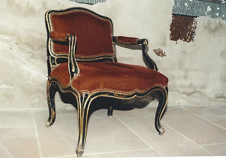 Fauteuil dit « à la reine » de forme contournée et sans décor. Eléments moulurés assemblés par chevilles. Siège ouvert et dossier bas. Rembourrage avec garniture de velours fixée par des clous.