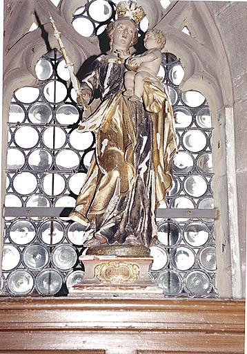 Vierge debout sur une terrasse, portant l'Enfant sur son bras gauche. Sceptre et couronne rapportés. Sur le socle de la statue, un cartouche rocaille porte une inscription. Brancard de la statue conservé.