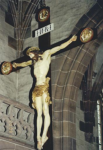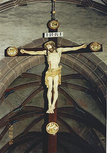 La statue du Christ pourrait dater de la 1ère moitié du 16e siècle. La croix est plus récente de même que les médaillons portant les symboles des évangélistes (2e moitié du 19e siècle ?).
