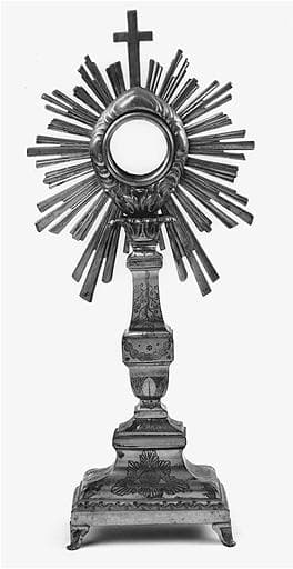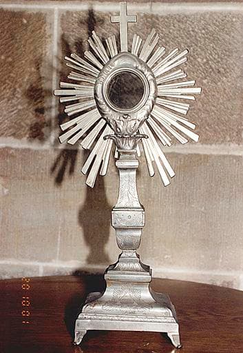 Reliquaire en forme d'ostensoir. Pied rectangulaire, tige en balustre, ouverture circulaire entourée de nuées et d'une gloire. Porte vitrée fermée à l'arrière par un loquet.