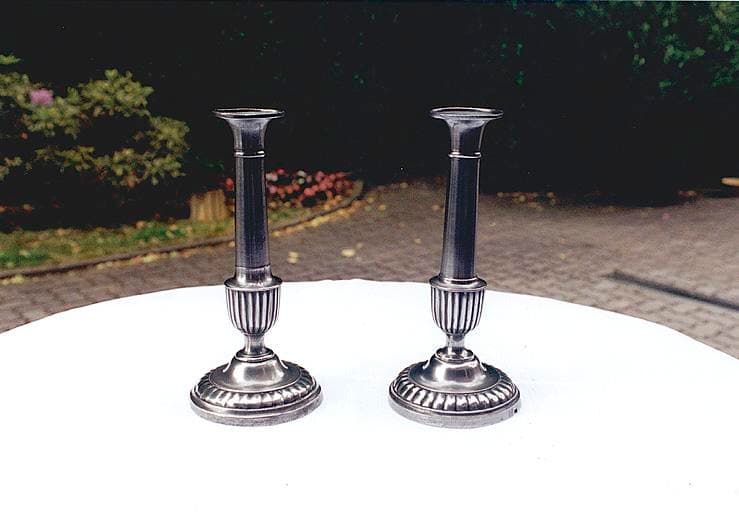 Chandeliers du culte protestant, ornés d'une frise de perles sur le pied, aux noeuds en balustres godronnés.