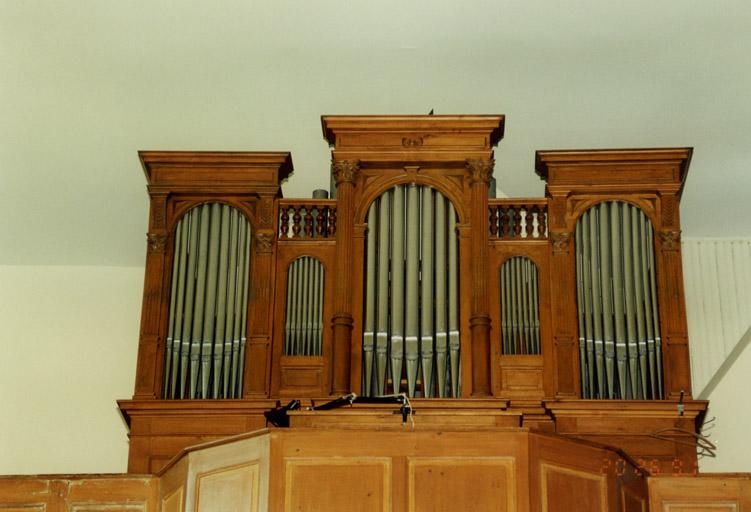Orgue à trois tourelles plates à entablement et deux plates-faces ouvertes par des arcs en plein cintre. Tourelle centrale flanquée de colonnes, les tourelles latérales de pilastres. Deux claires-voies à balustres tournés. Console indépendante ; façade en zinc.