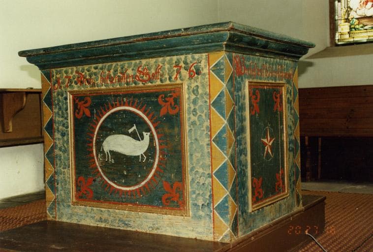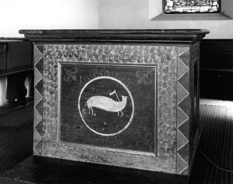 Autel quadrangulaire, à plateau débordant. Les quatre faces à panneaux moulurés et cadres rapportés, sont peintes : décor faux marbre, Agneau sur la face antérieure. A l'arrière, une porte à un battant ; serrure en fer forgé.