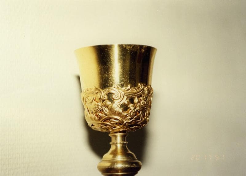 Calice formé de deux éléments différents : le pied et la tige sont en cuivre, au décor rare ; la fausse coupe porte un riche décor de fleurs et de rocailles ; elle est peut-être en argent (le calice n'a pas pu être démonté pour voir les poinçons).