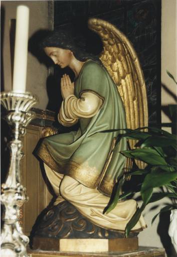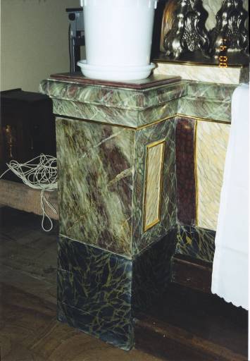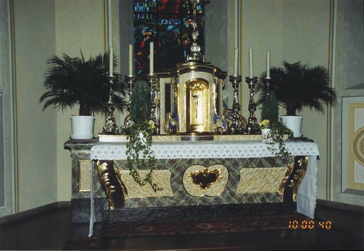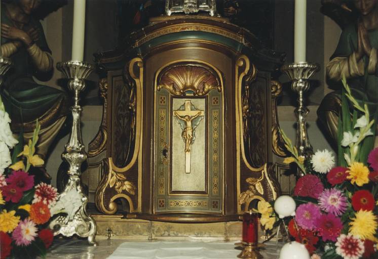 Autel qui pourrait dater du 3e quart du 18e siècle, repeint au dernier quart du 19e siècle, époque à laquelle furent ajoutés les anges orants et peut-être les piédestaux destinés à les porter, de part et d'autre du tombeau.£Après inventaire, en 2000, l'autel a été restauré, repeint et redoré. Selon un renseignement oral du président de fabrique, à cette occasion, un sondage a révélé une peinture façon marbre sur le piédestal de l'ange de gauche, peinture qui après avoir été rafraîchie, a été maintenue comme témoin puis imitée pour le décor du restant de l'autel effectué par Edgar Mahler. Les anges orants ont été enlevés lors de cette restauration.
