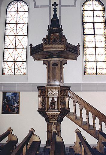 De style néo-roman, la chaire à prêcher forme un ensemble homogène avec le reste du mobilier de l'église qui a probablement été réalisé dans la région au courant du 4e quart du 19e siècle, peu après l'achèvement de la reconstruction de l'édifice.