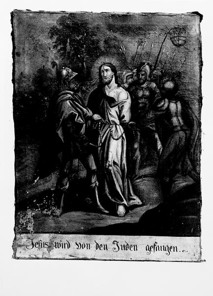 scène biblique (Arrestation du Christ, Jésus cloué sur la Croix, Christ en croix : Vierge, saint Jean, sainte Madeleine, Mise au tombeau)