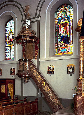 Chaire installée dans l'ancienne église en même temps que les autels secondaires, vers 1770.