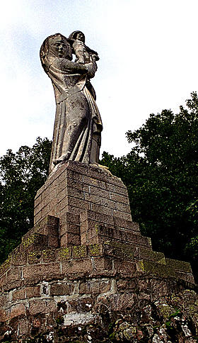 Statue sculptée dans la pierre grise des carrières de Chauvigny (Vienne) sur un socle de granite.