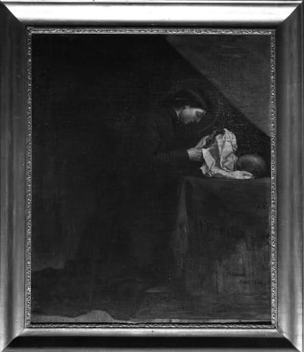 Le saint est représenté sous les traits d'un jeune homme, en soutane, agenouillé devant une table recouverte d'une nappe à franges, la tête inclinée vers un crucifix qu'il tient enveloppé dans un linge blanc. Sur la table, une tête de mort. La tête du saint est nimbée.