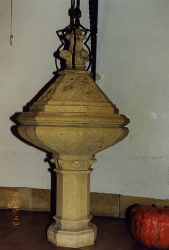 Autel de plan rectangulaire, à quatre colonnettes dans les angles, posé sur un emmarchement à un seul degré, plateau en chêne. Chaire de plan hexagonal, à cuve suspendue, à escalier droit et abat-voix en bois. Les fonts baptismaux sont de plan octogonal. Le couvercle en pierre pivote à l'aide d'un axe métallique.