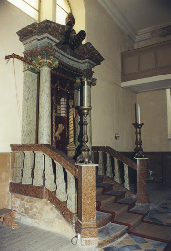 Arche sainte architecturée de style néo-classique, à deux colonnes supportant un entablement légèrement cintré et fronton triangulaire interrompu. Emmarchement à quatre degrés.
