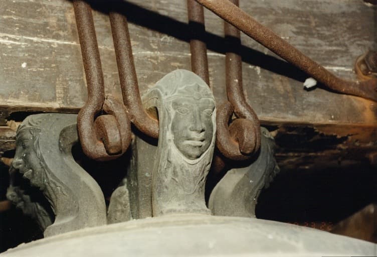 La décoration de la cloche réside essentiellement dans la partie supérieure : les anses (têtes humaines), les inscriptions et les figures de saintes, avec des frises de feuillages.