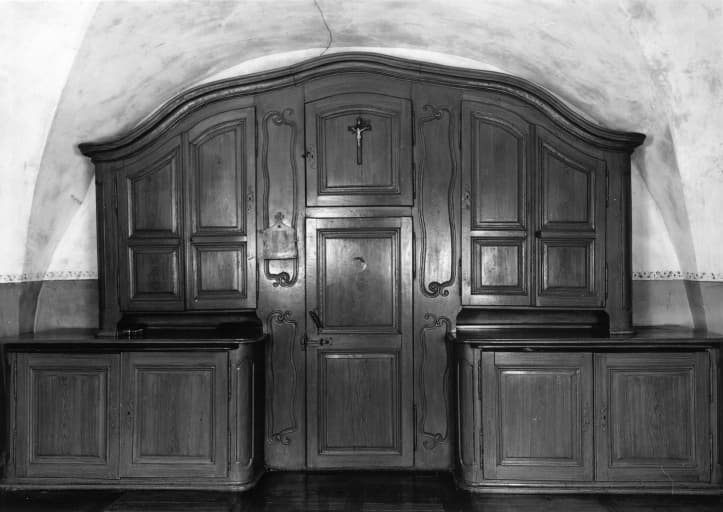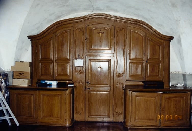Le meuble est appuyé contre le mur est de l'ancien choeur devenu sacristie, dont il épouse vaguement la forme. La partie centrale, accostée de deux buffets bas, est percée d'une porte donnant accès à l'escalier du clocher.