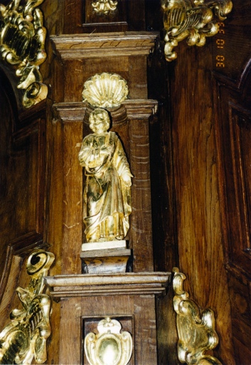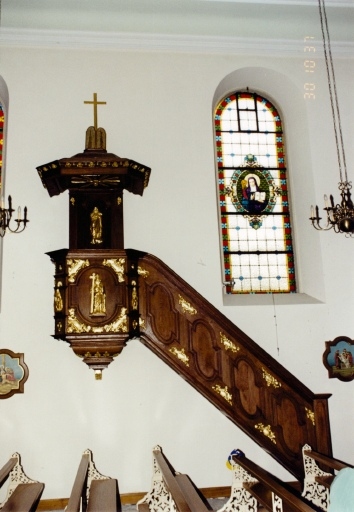 Un renseignement oral indiquant que certains éléments de décor proviendraient de l'ancienne abbaye de Lucelle et seraient datés de 1621 ne semble pas exact. La chaire est vraisemblablement du milieu du 19e siècle, structure, statues, éléments rapportés.