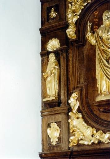 Sur les angles de la cuve : statuettes représentant saint Jean, saint Pierre, saint Paul, sur le panneau principal de la cuve : la Religion, sur le panneau latéral de la cuve : le Christ enseignant, sur le dorsal : le Bon Pasteur, sur l'abat-voix : les tables de la Loi surmontées d'une croix, sous l'abat-voix : la colombe du Saint-Esprit.