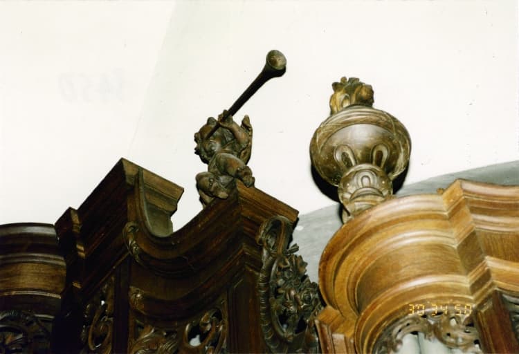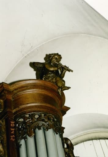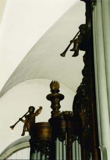 Le buffet est très composite : corps central accosté de deux corps à 3 tourelles et deux tourelles extérieures, avec plates-faces entre ces éléments. Le positif de dos est factice. Pots à feux décoratifs et anges musiciens sont posés sur la corniche.
