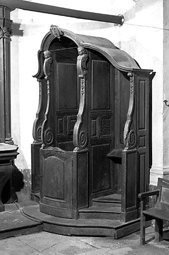 Confessionnal formé d'une loge centrale voûtée en berceau, et de deux loges latérales dont les voûtes affectent un mouvement de courbe et contre-courbe ; le portillon est de forme cintrée ; les panneaux sont à grands cadres vrais, chevillés, avec table saillante et mise au mollet ; reliefs rapportés et chevillés (volutes de part et d'autre de la loge centrale) ; bas-reliefs taillés dans la masse (décor du portillon et fleurons des volutes) ; serrure du portillon en fer