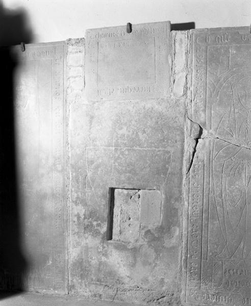 Epitaphe gravée en lettres gothiques sur le pourtour, se poursuivant en lettres romaine dans le champ.
