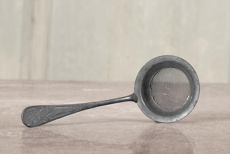 Passoire à manche en métal étamé (?) ; décor en relief.