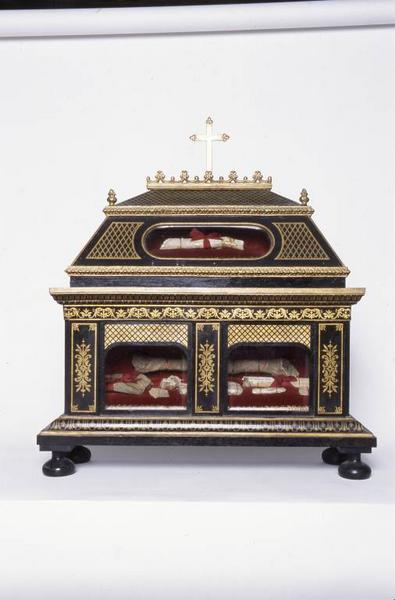 Châsses en chêne peint en noir et or à couvercle en forme de toit brisé à croupes. Corps des reliquaires à décor peint en doré et corniche rapportée en métal. Couvercle emboîté maintenu par 2 tenons rectangulaires à l'avant et 2 pattes métalliques à l'arrière, assemblage à queues d'aronde aux angles ; moulures, crête et croix en métal clouées ou vissées.
