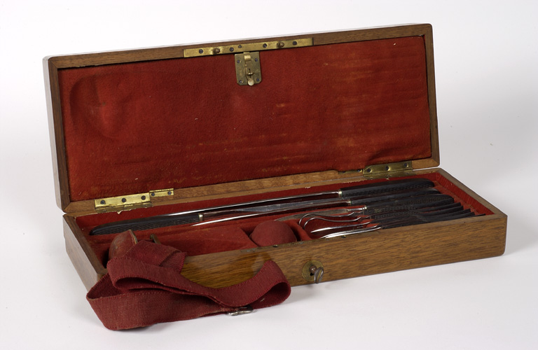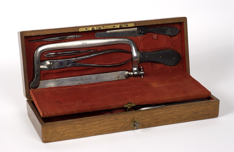 Une trousse en cuir noir contenant les instruments de chirurgie urologique et un coffret en bois contenant les instruments de chirurgie plus classique, essentiellement des instruments d'incision pour la chirurgie d'amputation. Deux instruments scientifiques de fonctions non identifiées.