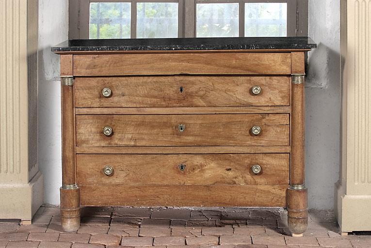 Commode à trois tiroirs garnis de boutons de tirage et d'entrée de serrure en bronze. Montants antérieurs en forme de colonnes à base et chapiteau en bronze. Dessus en marbre noir.