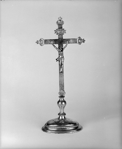 Pied oblong ; noeud piriforme à un anneau ; croix fleuronnée sortant d'une palmette.£Christ : moulé et rapporté