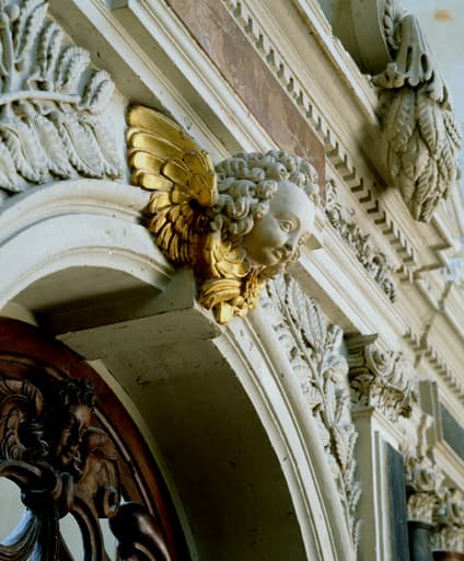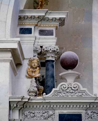 calcaire : appareillé, taillé, mouluré, doré, décor en relief, décor dans la masse ; marbre : taillé, tourné, poli ; chêne : taillé, mouluré, poli, décor en relief, décor dans la masse