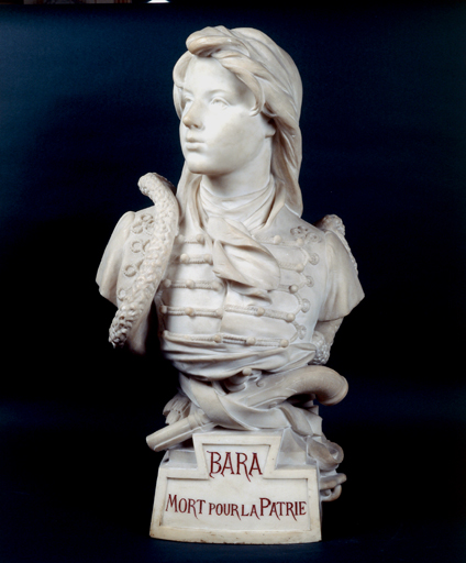 Inscription sur la face antérieure du piédouche : Bara mort pour la Patrie. Sur le côté gauche du piédouche : Noël Ruffier.