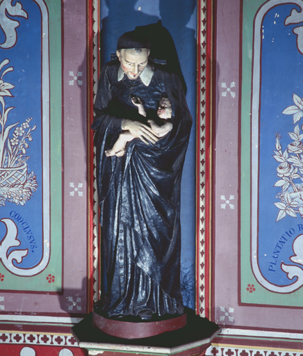 saint François d'Assise : debout, croix, chapelet ; saint Augustin : debout, crosse, coeur, flamme ; saint Vincent de Paul : debout, enfant ; saint Joseph : debout, lys