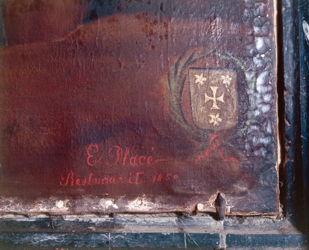 Le tableau se compose d'une partie rectangulaire verticale surmontée d'une partie en plein-cintre et moins large. La toile comporte deux lés cousus verticalement dans la partie inférieure.